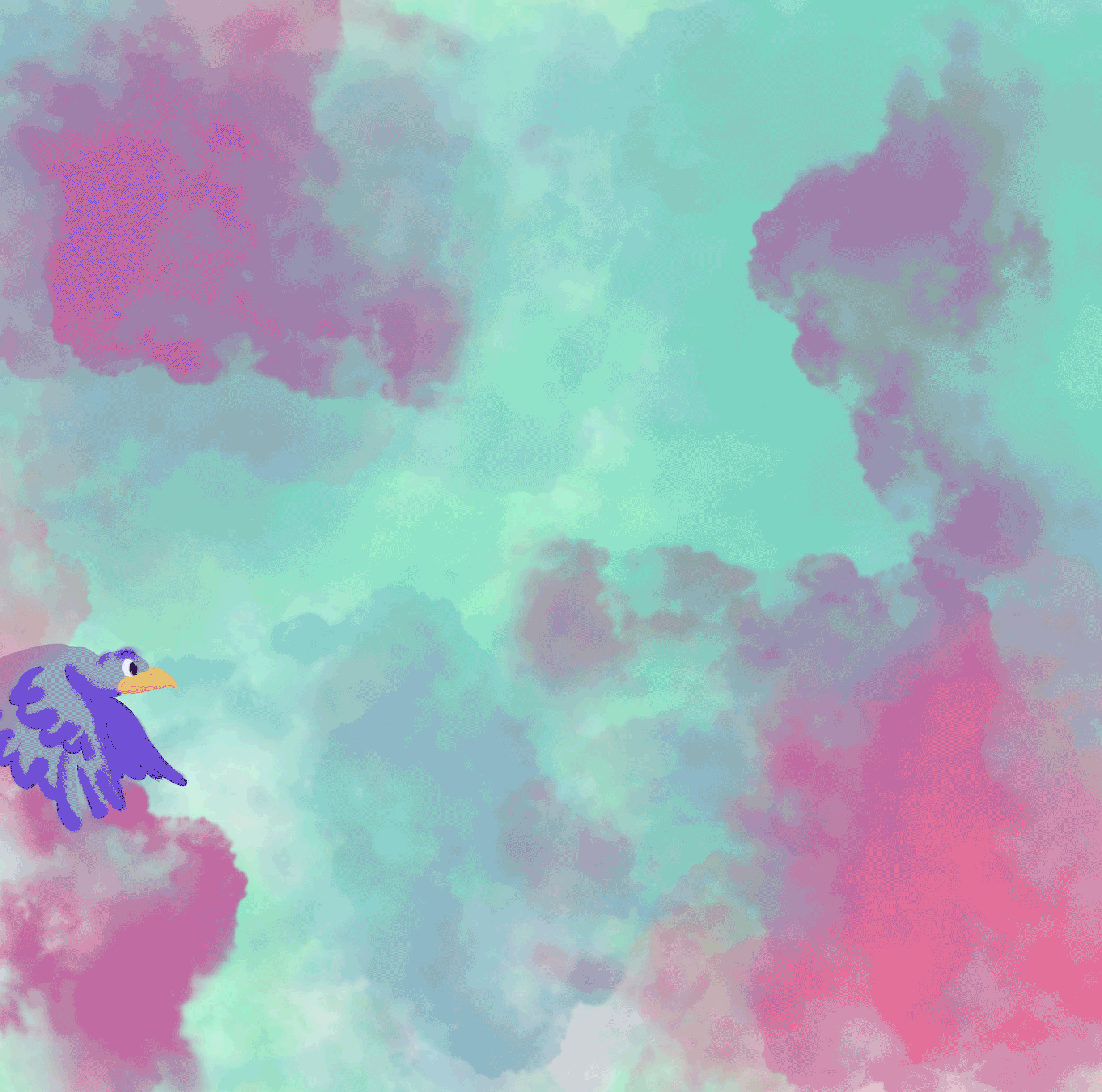 A animated flying bird flying though a dense cloudy sky.