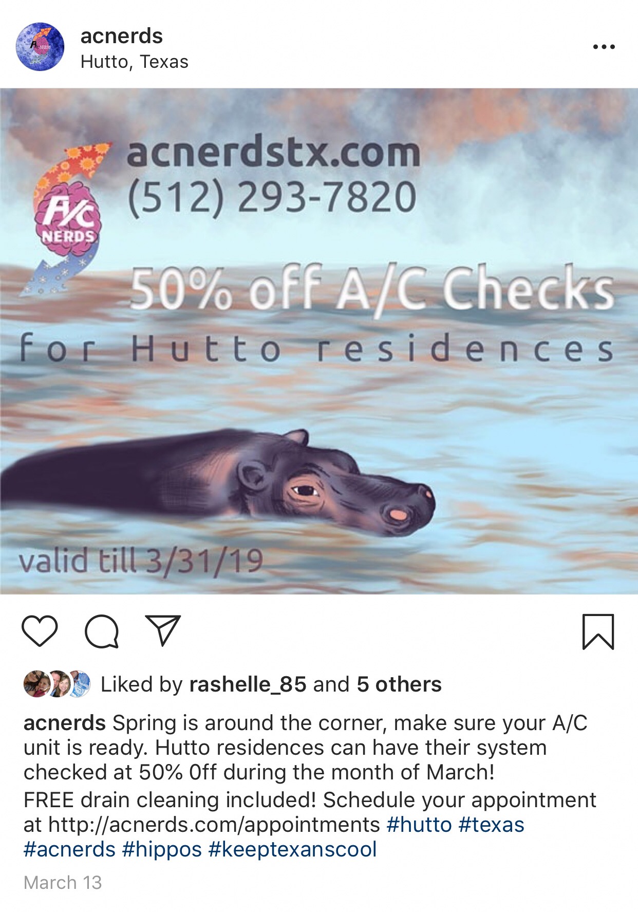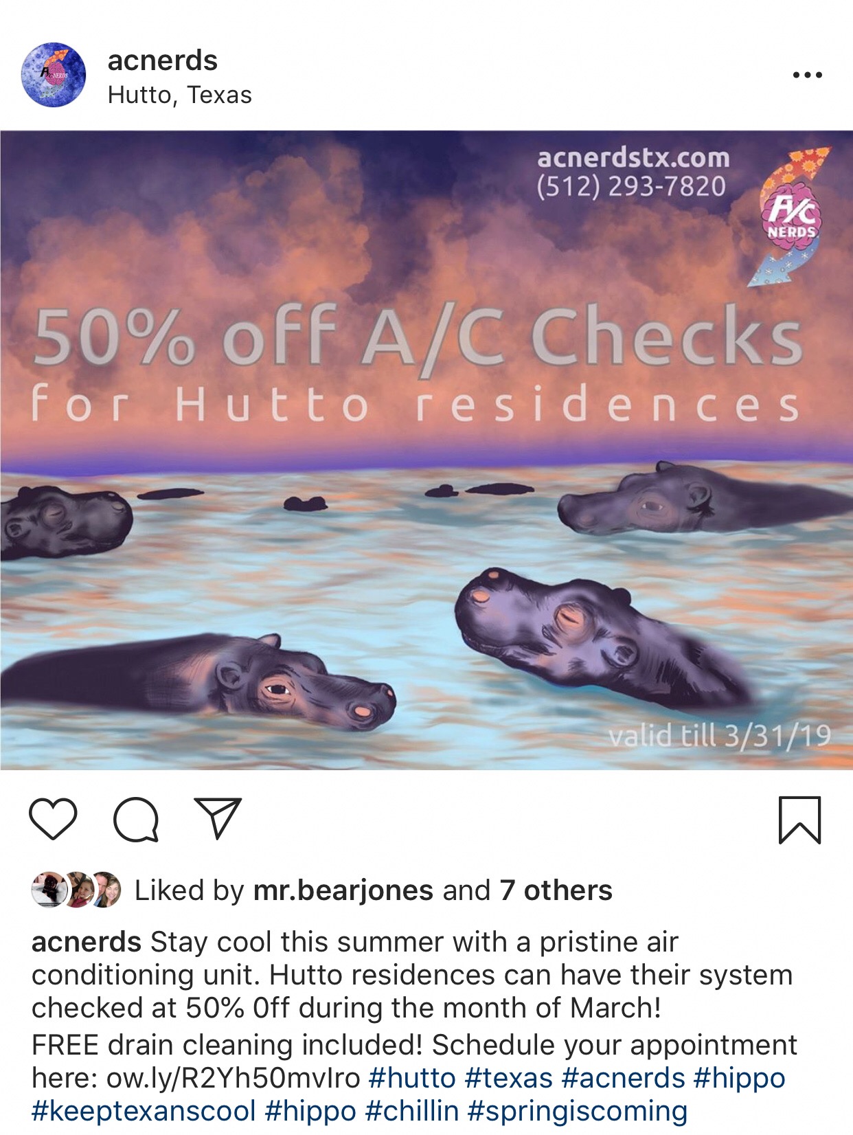 The A/C Nerds wanted to grab the attention of their local community near central Texas, Hutto. With a short social media campaign and hand-drawn illustrations we were able to let their community know that the A/C Nerds are there to keep all hippos cool.
