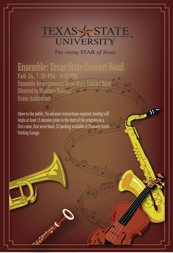 A poster and digital ad for an ensemble performance by the Texas State concert band..