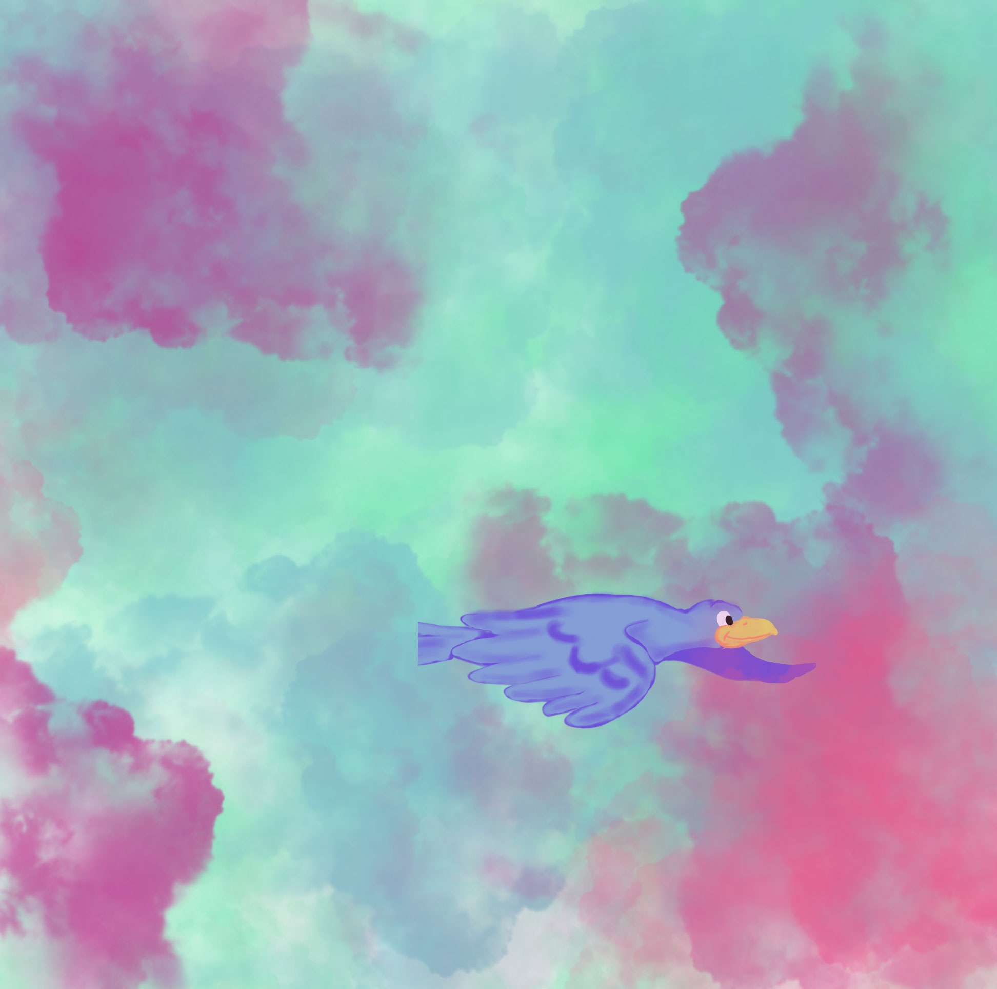 A animated flying bird flying though a dense cloudy sky.