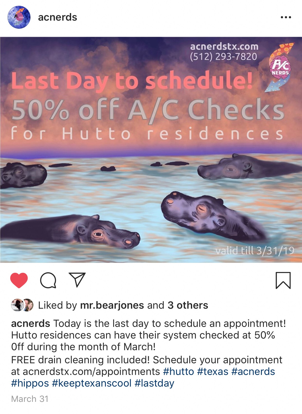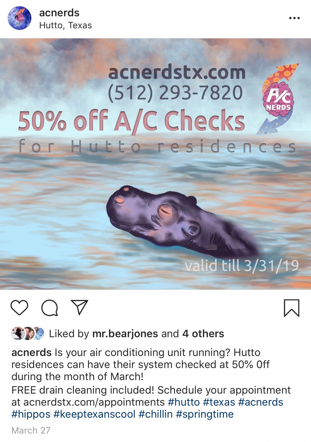 The A/C Nerds wanted to grab the attention of their local community near central Texas, Hutto. With a short social media campaign and hand-drawn illustrations we were able to let their community know that the A/C Nerds are there to keep all hippos cool.