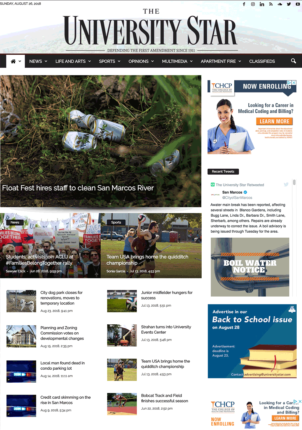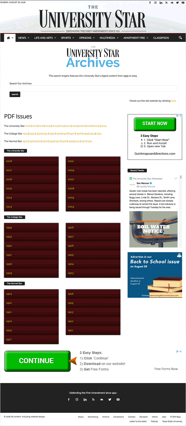 A contemporary website for the newspaper at Texas State University, The University Star.